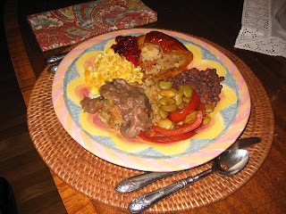 Here are some pictures of my first veggie Thanksgiving, starting with a peek inside the Stuffed Pumpkin ( see November 22 post)...and then, it's on to the Safely Wild Mushroom Gravy recipe.